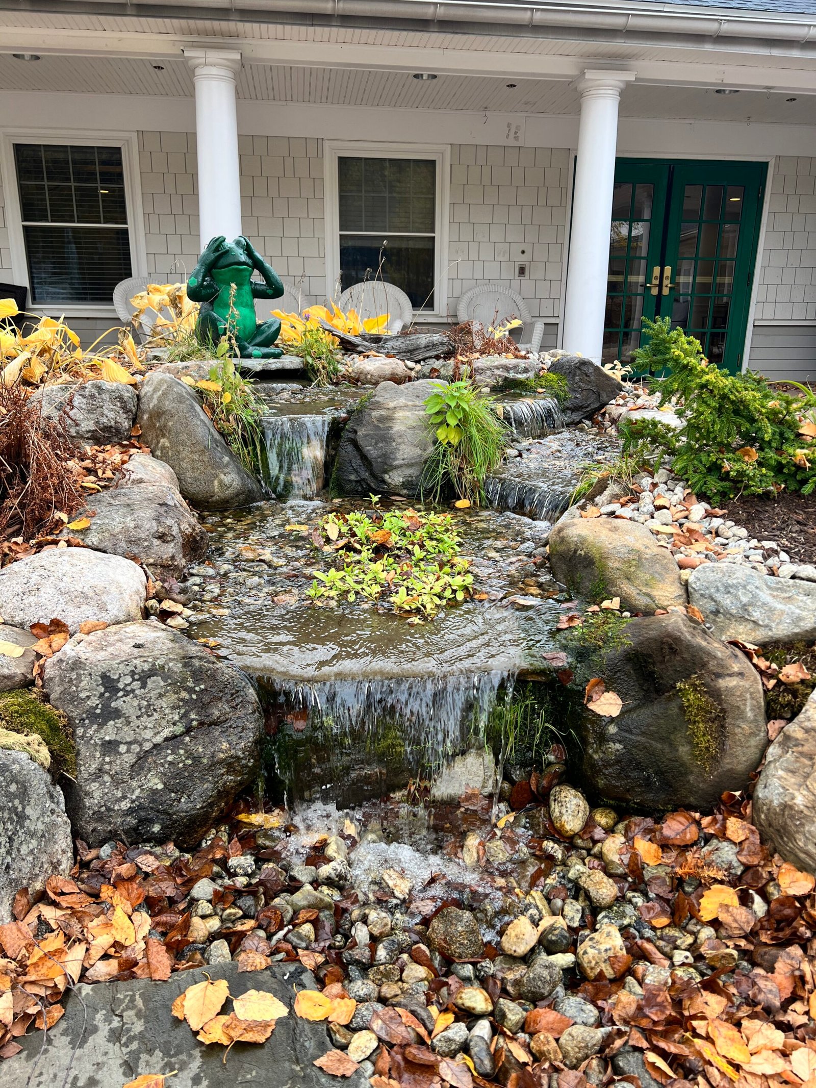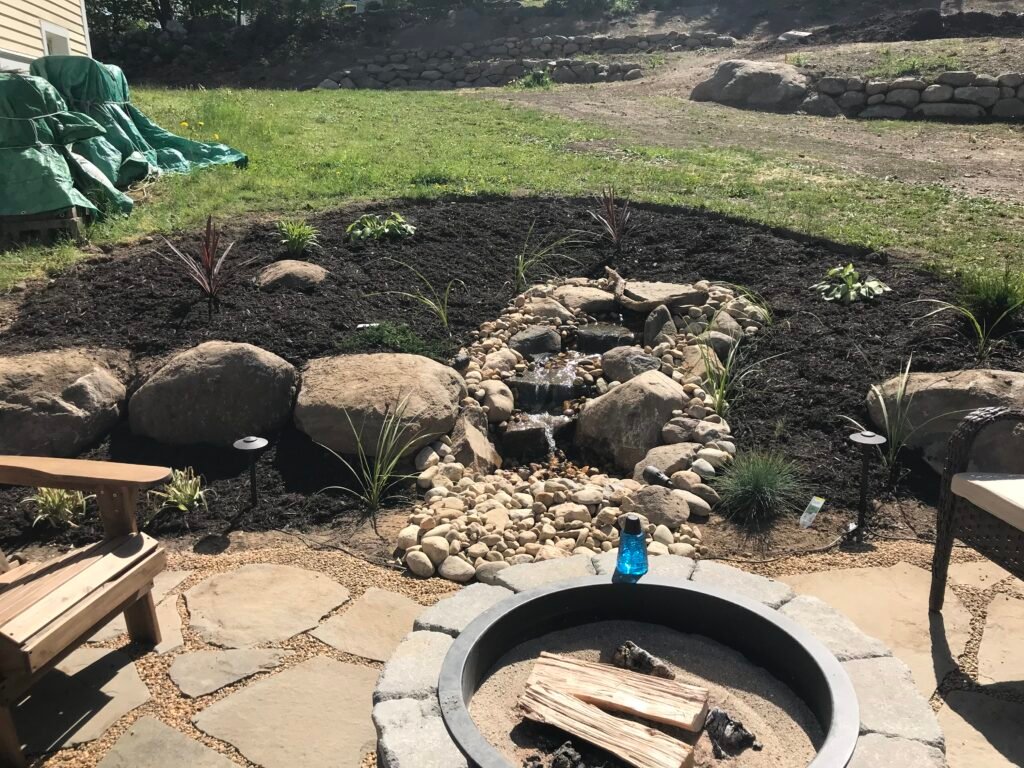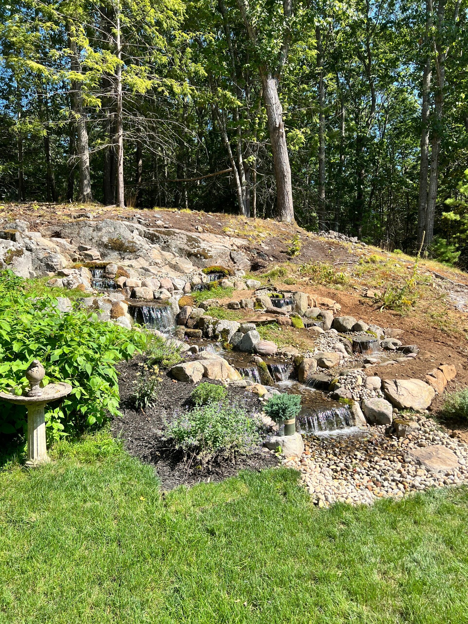 A Pondless waterfall consists of a EPDM lined watercourse, with carefully crafted falls and streams. We use local granite and gravel to recreate falls you would come across in nature. The systems name comes from the lack of a pond that recirculates the water. In a Pondless® we create a underground reservoir comprised of Aquablox®, and a pump vault. We disguise all of these mechanical components with rock work and plantings. Water is circulated to the top of the fall via a pump. Unlike a pond where running a pump is necessary for filtering and oxygenating water to support fish, a pondless can be safely shut off to conserve electricity when not being used.
